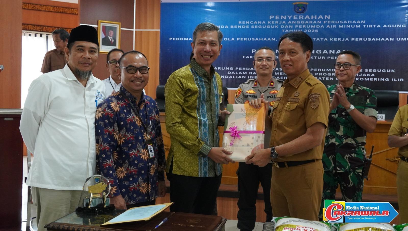 Pada acara ini juga dilakukan penyerahan Rencana Kerja Anggaran Perusahaan (RKAP) Tahun 2025 untuk Perumda Bende Seguguk dan Perumda Air Minum Tirta Agung, serta penandatanganan Fakta Integritas oleh jajaran direksi. Pj. Bupati menekankan pentingnya penerapan prinsip-prinsip Good Corporate Governance (GCG) dalam pengelolaan perusahaan daerah.