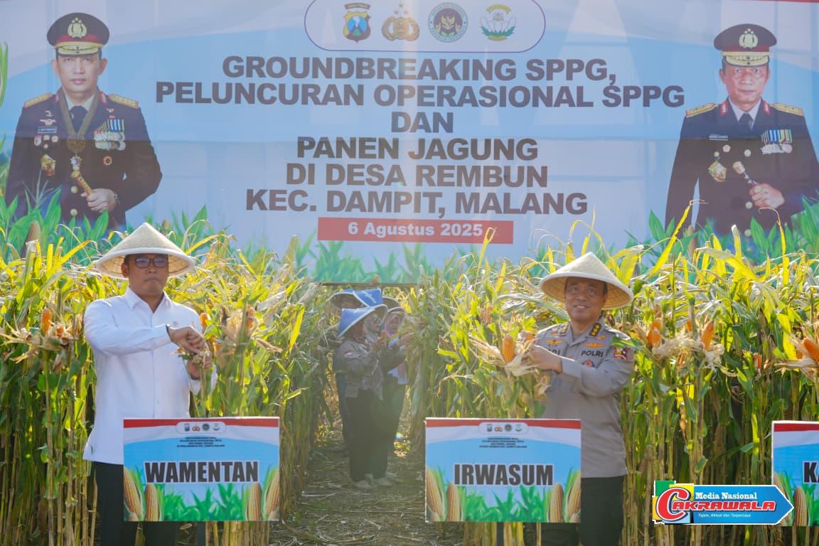 POLDA JATIM,Cakrawala – Suasana semarak panen raya jagung menyelimuti hamparan lahan pertanian di Desa Rembun, Kecamatan Dampit, Kabupaten Malang, Rabu (6/8/2025). Ribuan tongkol jagung berwarna keemasan menandai keberhasilan kolaborasi lintas sektor dalam mendukung program ketahanan pangan nasional.