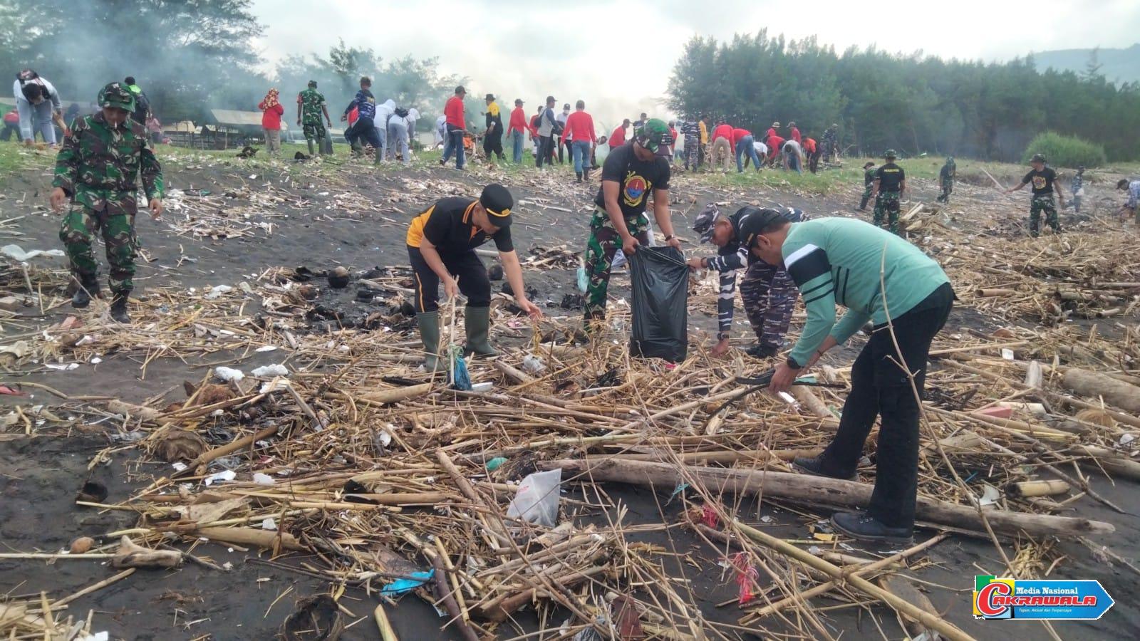 Sejumlah personel Polsek Puger yang merupakan jajaran Polres Jember Polda Jatim bersama anggota TNI dan masyarakat gotong royong menyisiri pantai, mengumpulkan sampah kayu, bambu, serta limbah yang terbawa arus laut dan berserakan di sepanjang pantai.