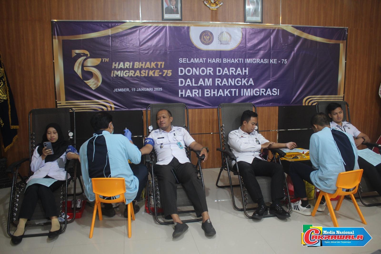 JEMBER, MN Cakrawala– Dalam rangka memperingati Hari Imigrasi yang ke-75, pegawai Lapas Kelas IIA Jember menunjukkan kepedulian sosial mereka dengan berpartisipasi dalam aksi donor darah pada Rabu (16/01/2025). Kegiatan mulia ini berlangsung di Aula Kantor Imigrasi Kelas I TPI Jember.