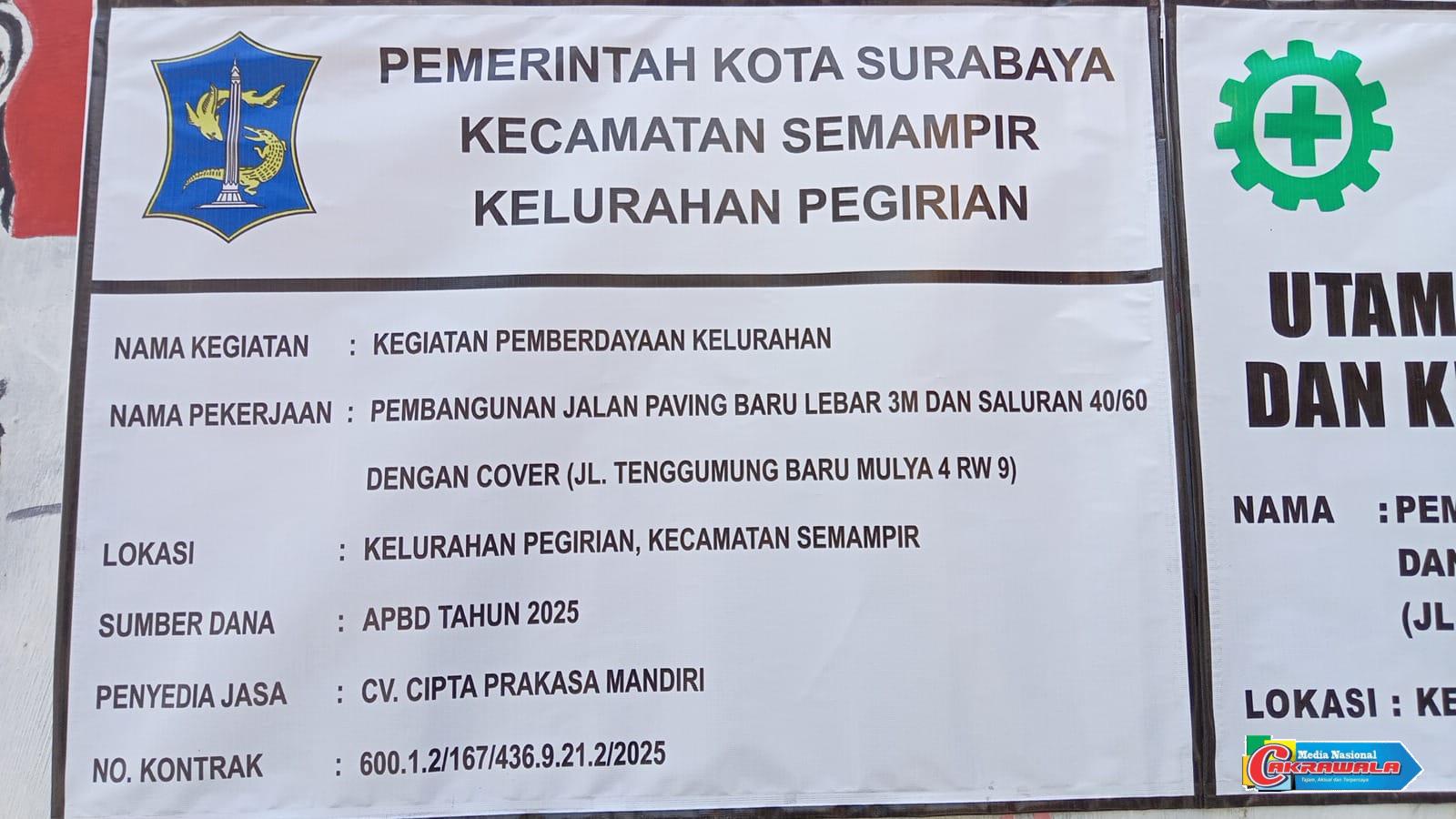 Surabaya,Cakrawala-Melalui satuan kerja Kecamatan semampir merealisasi anggaran bersumber APBD 2025 atau disebut (dakel) dana kelurahan Pembangunan jalan paving baru 3 meter saluran 40.60 jalan tenggumung baru mulya IV RW 09 dengan anggaran Rp.618.246.928,00.