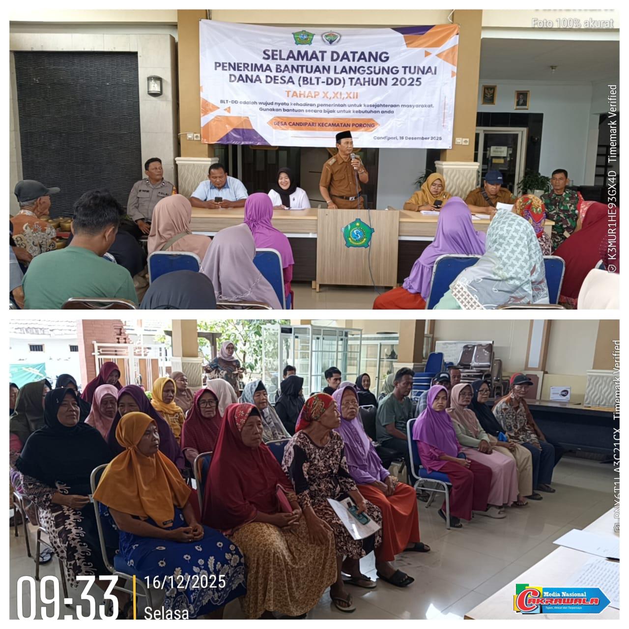 Sidoarjo,MN Cakrawala– Pemerintah desa Candipari laksanakan kegiatan pembagian Bantuan Langsung Tunai Dana Desa Tahap Akhir (Oktober, November, Desember) kepada warga masyarakat kurang mampu sebanyak 39 KPM bertempat di Balai Desa Candipari, Selasa (16/12/2025).
