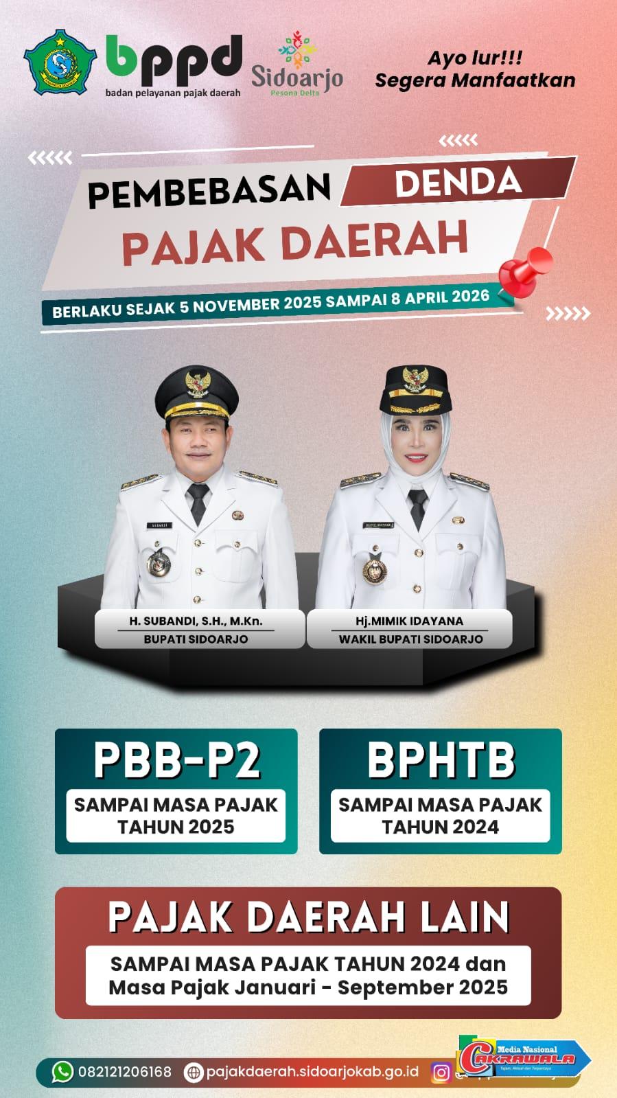 Sidoarjo, MN Cakrawala– Program pembebasan sanksi administratif pajak daerah dilakukan Pemkab Sidoarjo. Program penggratisan denda keterlambatan pembayaran pajak daerah itu telah dimulai 5 November 2025 dan akan berakhir tanggal 8 April 2026. Kebijakan itu untuk mengintensifikasikan pajak daerah dan optimalisasi Pendapatan Asli Daerah/PAD Kabupaten Sidoarjo dari sektor Pajak Daerah,
