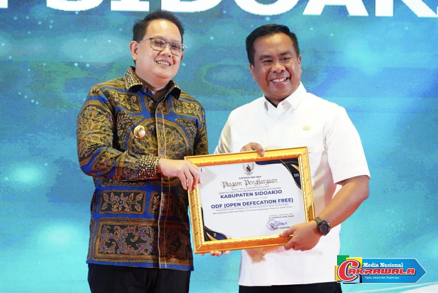 Sidoarjo, MN Cakrawala– Pemerintah Kabupaten Sidoarjo menerima penghargaan Open Defecation Free (ODF) dari Pemerintah Provinsi Jawa Timur. Penghargaan tersebut diserahkan langsung oleh Penjabat (Pj) Gubernur Jawa Timur, Adhy Karyono kepada Pjs. Bupati Sidoarjo Muhammad Isa Anshori pada puncak acara Hari Kesehatan Nasional ke-60 di Hotel Aston Sidoarjo, Kamis (21/11/2024).