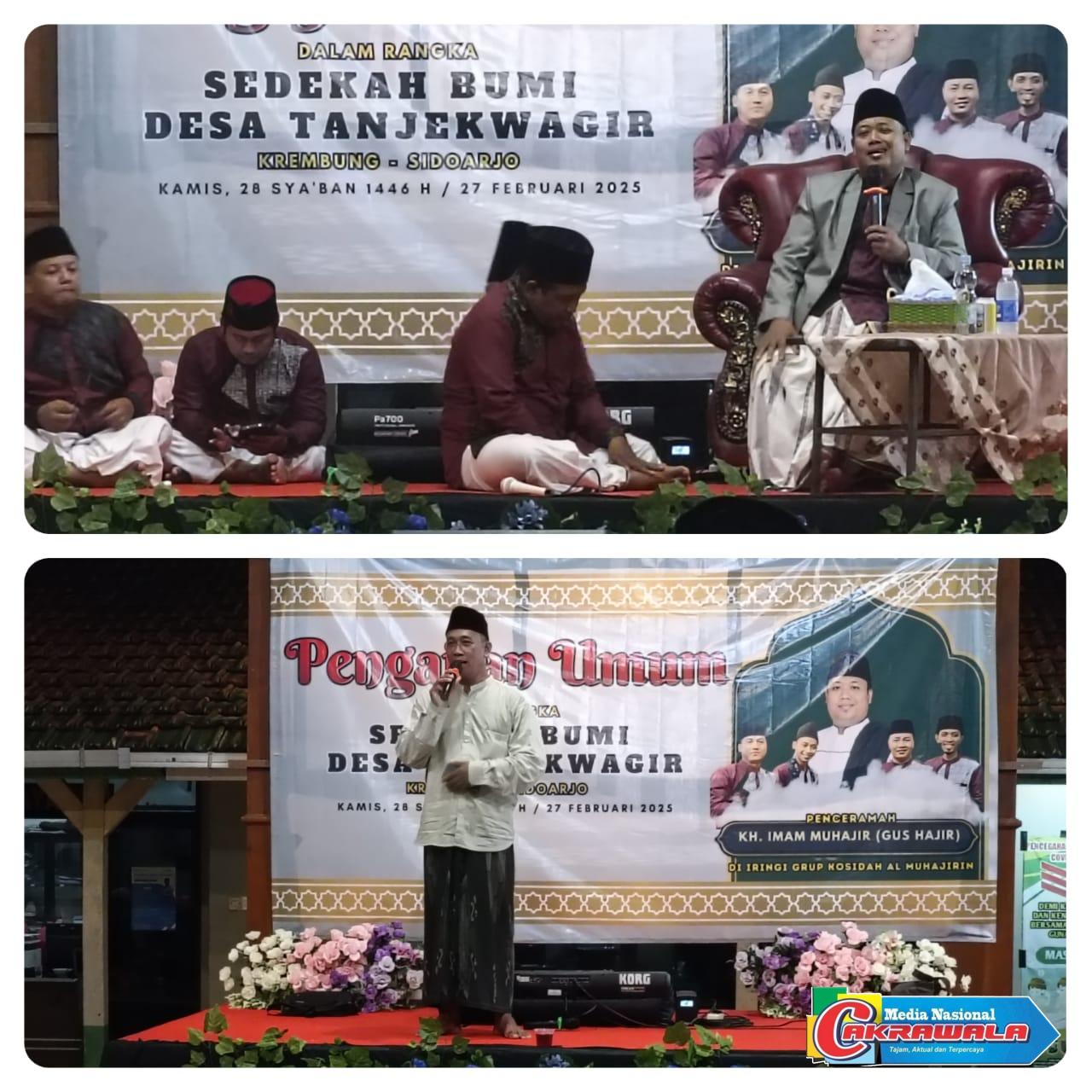 Sidoarjo, MN Cakrawala-Kegiatan desa sedekah bumi merupakan salah satu kegiatan adat yang mencerminkan kebersamaan dan syukur atas Rahmat yang telah diberikan Allah swt. Pelestarian adat ini biasanya dilaksanakan di bulan ruwah, Sedekah Bumi bisa diartikan bersih desa atau ruwatan desa, disebelum bulan puasa. Desa Tanjekwagir melaksanakan kegiatan tersebut yang sudah menjadi kegiatan rutin tahunan dilaksanakan di pendopo desa, Kamis (27/02/2025).