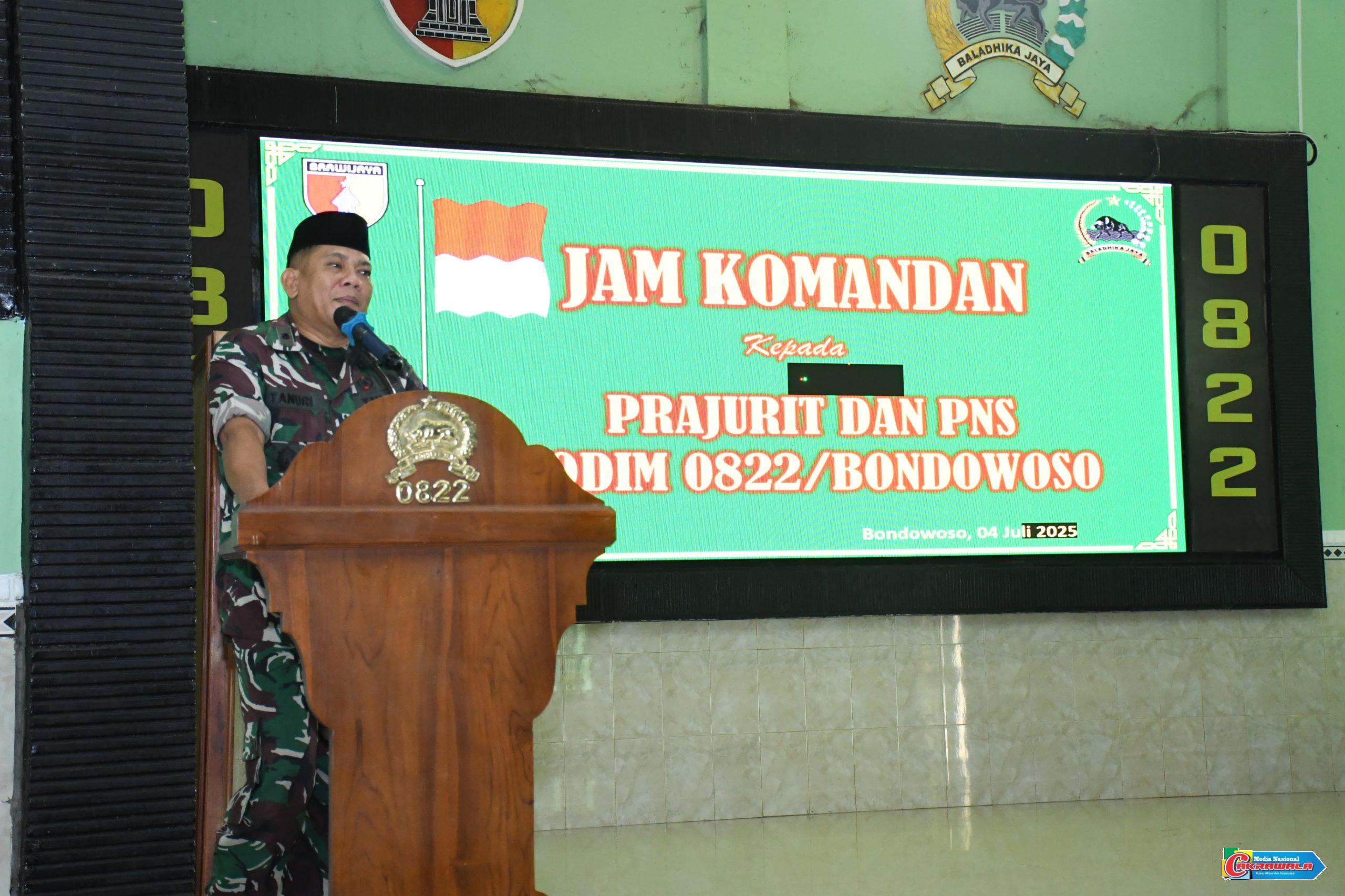 Kegiatan diawali dengan doa dan renungan bersama sebagai bentuk introspeksi diri, kemudian dilanjutkan dengan sesi Jam Komandan yang menjadi wadah pengarahan serta pembinaan mental dan karakter bagi seluruh prajurit dan PNS TNI. Dalam arahannya, Kasdim Mayor Inf Tanuri menekankan pentingnya menjaga keharmonisan rumah tangga serta menjauhi hal-hal yang dapat merusak masa depan prajurit.