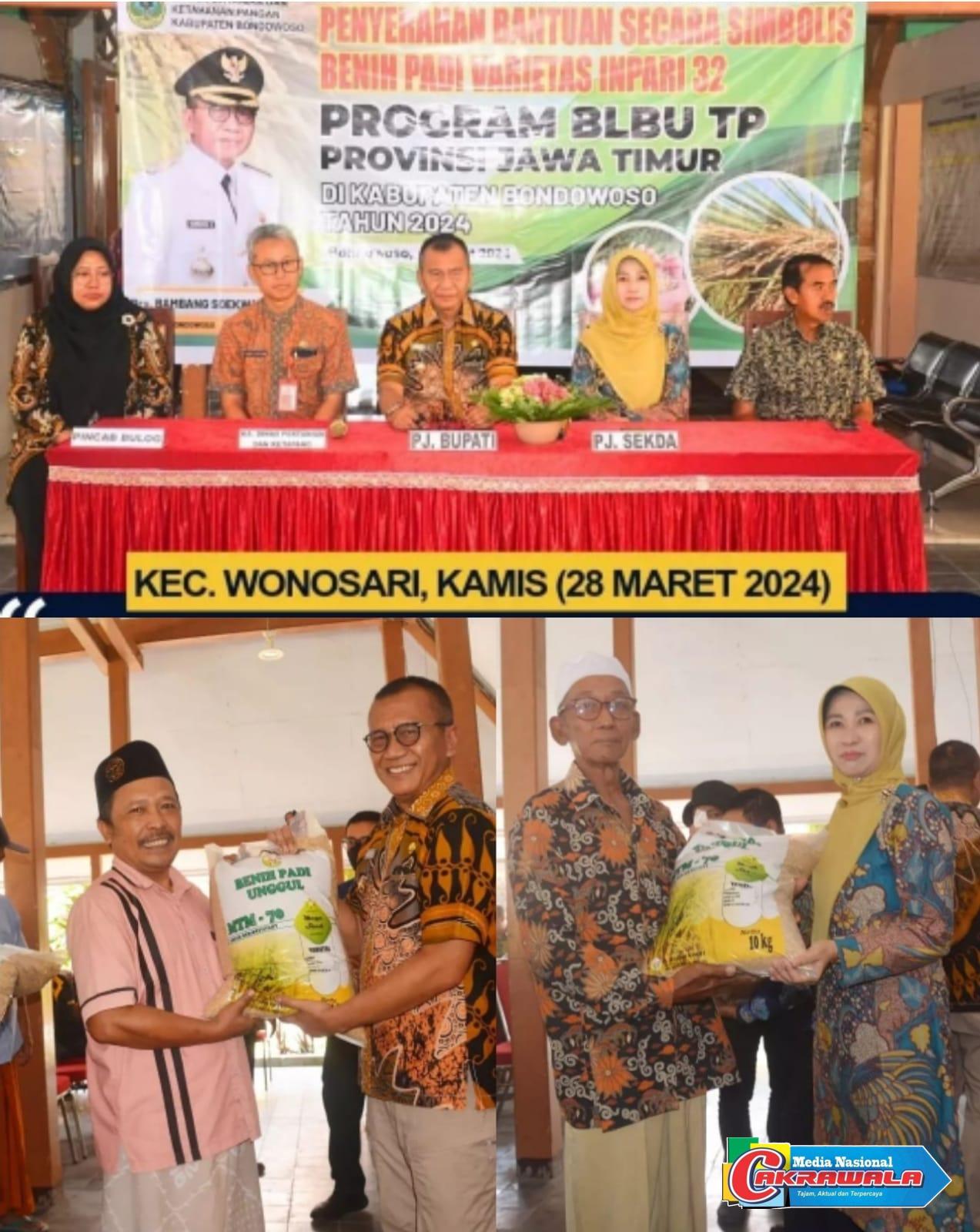 Penyerahan secara simbolis disampaikan oleh Pj Bupati Bondowoso, Bambang Soekwanto dan Pj Sekda Bondowoso, Haeriyah Yuliati, di Pendopo Kecamatan Wonosari,juga Pj mengingatkan kepada petani bibit padi gratis ini jangan di jual,Kamis (28/3/2024).