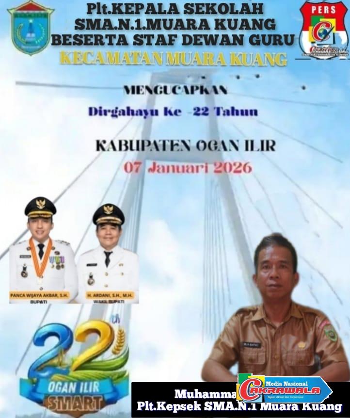 Ogan Ilir – MN Cakrawala -Dalam Rangka memperingati HUT OganIlir ke 22 Tahun 2026,Plt.Kepala SMA N 01 Muara Kuang, Muhammad Hidayat.S,Pd. Beserta Staf Dan Jajarannya,Menggucapkan selamat memperingati HUT Kabupaten Ogan Ilir yang ke-22 Tahun 2026