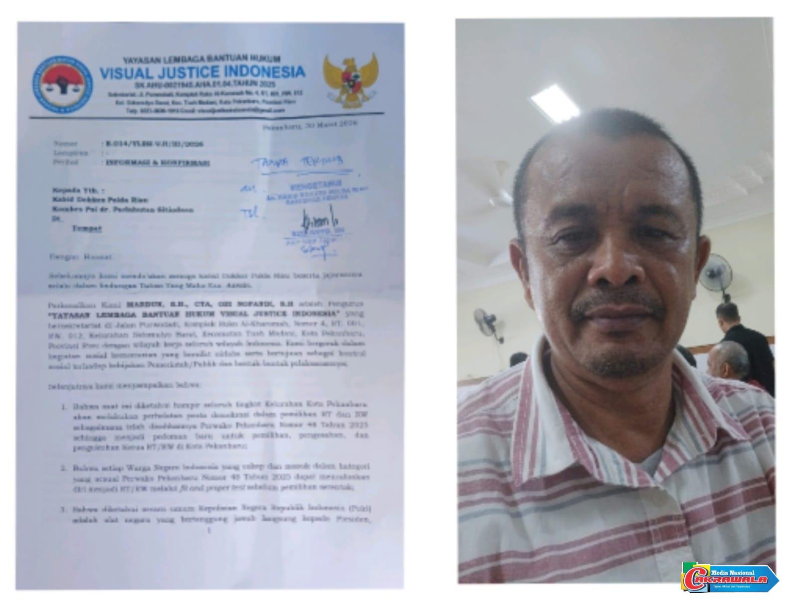Desakan itu datang dari YLBH Visual Justice Indonesia yang secara resmi melayangkan surat klarifikasi. Lembaga tersebut menyoroti pencalonan anggota kepolisian yang masih aktif bertugas sebagai Ketua RW 032 di Kelurahan Sialangmunggu, Kecamatan Tuah Madani.