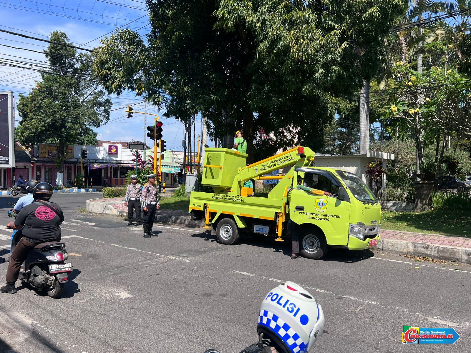 Pelaksanaan giat dimulai sejak pagi hari, dengan melibatkan personel Sat Lantas Polres Bondowoso yang secara aktif mengatur arus lalu lintas agar tetap lancar dan aman selama proses pemangkasan pohon berlangsung. Langkah ini merupakan bagian dari upaya preventif untuk menghindari potensi gangguan visual bagi pengguna jalan akibat tertutupnya rambu lalu lintas oleh dahan pohon yang rimbun.