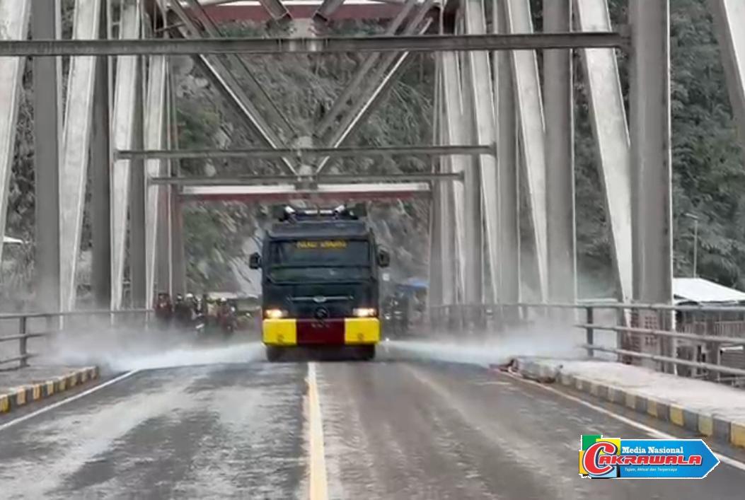 LUMAJANG,Cakrawala – Polres Lumajang Polda Jatim mengerahkan satu unit mobil Water Canon (AWC) untuk membantu membersihkan sisa material berupa lumpur dan abu vulkanik Awan Panas Guguran (APG) Gunung Semeru yang menumpuk di kawasan Jembatan Besuk Koboan Kecamatan Candipuro, Kamis (20/11/2025).