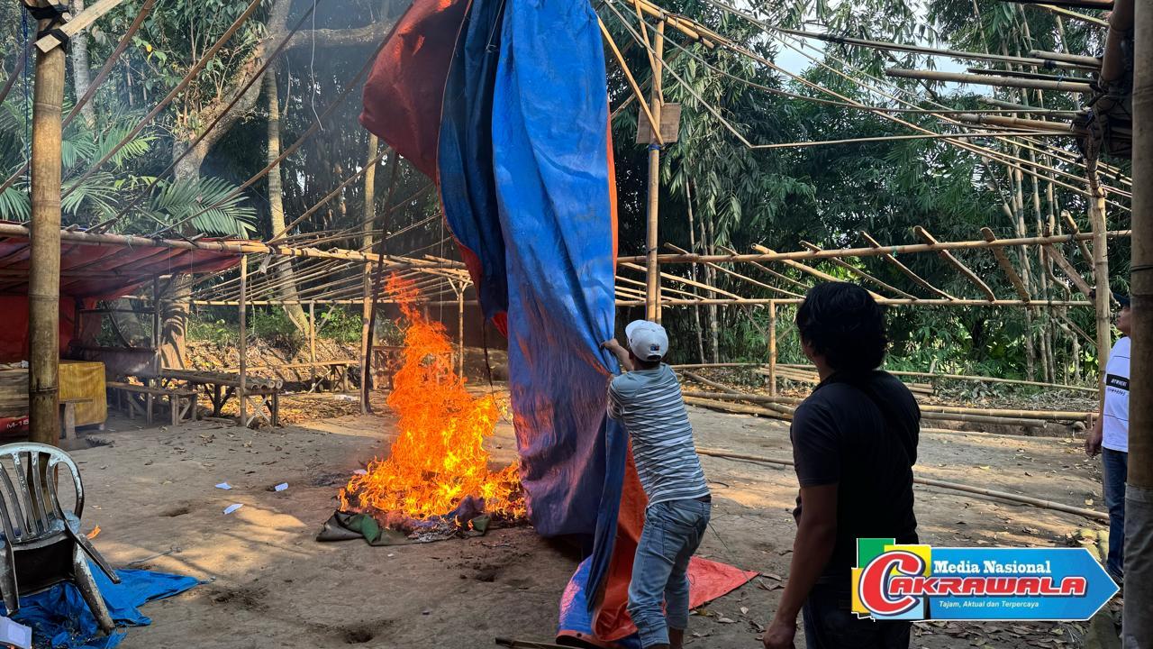 Untuk memastikan barang-barang tersebut tidak bisa digunakan kembali, petugas kemudian membakar seluruh terpal dan bambu hingga habis tak bersisa.
