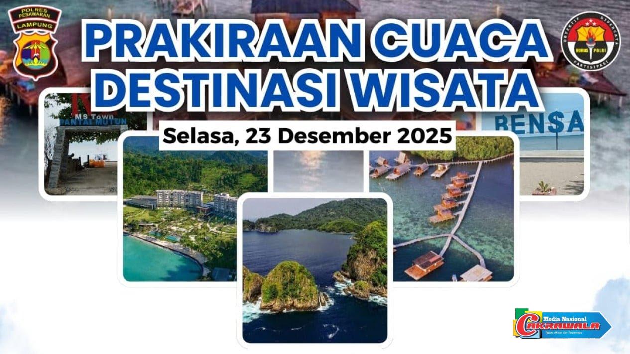 Pesawaran Provinsi Lampung-Cakrawala, Polres Pesawaran mengimbau masyarakat dan wisatawan untuk memperhatikan prakiraan cuaca di sejumlah destinasi wisata wilayah Kabupaten Pesawaran pada Selasa, 23 Desember 2025.