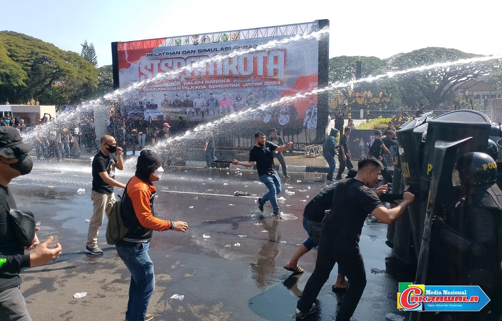 Tampak pada adegan simulasi, massa yang tidak puas berhasil dipukul mundur oleh Pasukan Pengendali Massa (Dalmas) Polresta Malang Kota.