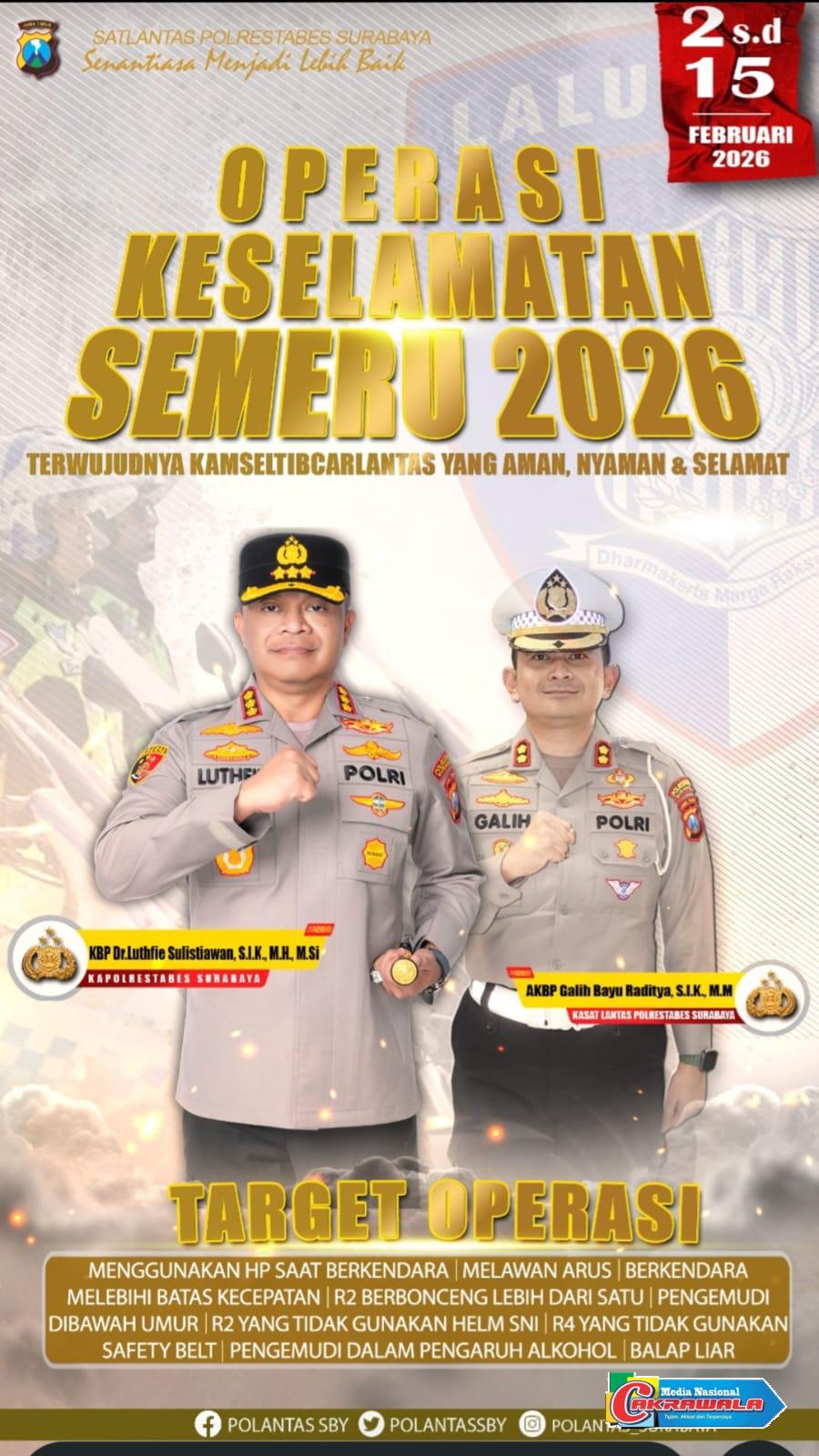 SURABAYA,MN Cakrawala — Polrestabes Surabaya resmi menggelar Operasi Keselamatan Semeru 2026 sebagai langkah strategis untuk menciptakan keamanan, keselamatan, ketertiban, dan kelancaran lalu lintas menjelang pelaksanaan Operasi Ketupat Semeru 2026.