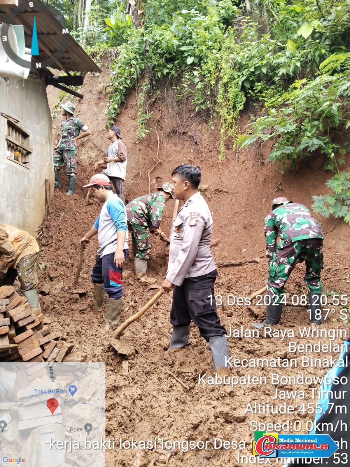 Bondowoso,MN Cakrawala-Dalam upaya membantu warga yang terdampak bencana tanah longsor, Kapolsek Binakal Iptu Widayanto, SH., bersama anggota Polsek Binakal, turut serta dalam kegiatan kerja bakti di rumah Bapak Sukadi yang terletak di Dusun Pal 16 wilayah Kecamatan Binakal.