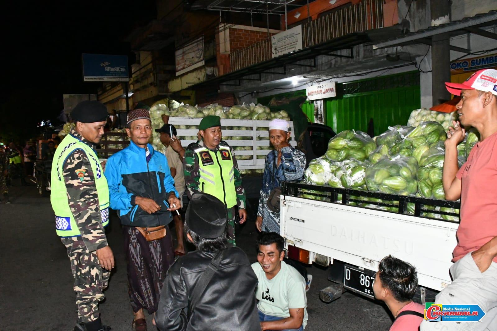 Bondowoso,Cakrawala-Suasana Pasar Induk Bondowoso pada Senin malam (22/9/2025) tampak berbeda. Di tengah hiruk pikuk aktivitas bongkar muat sayur mayur dari Banyuwangi, Jember, dan Probolinggo, hadir prajurit Kodim 0822 Bondowoso bersama Barisan Ansor Serbaguna (Banser) yang melakukan patroli bersama.