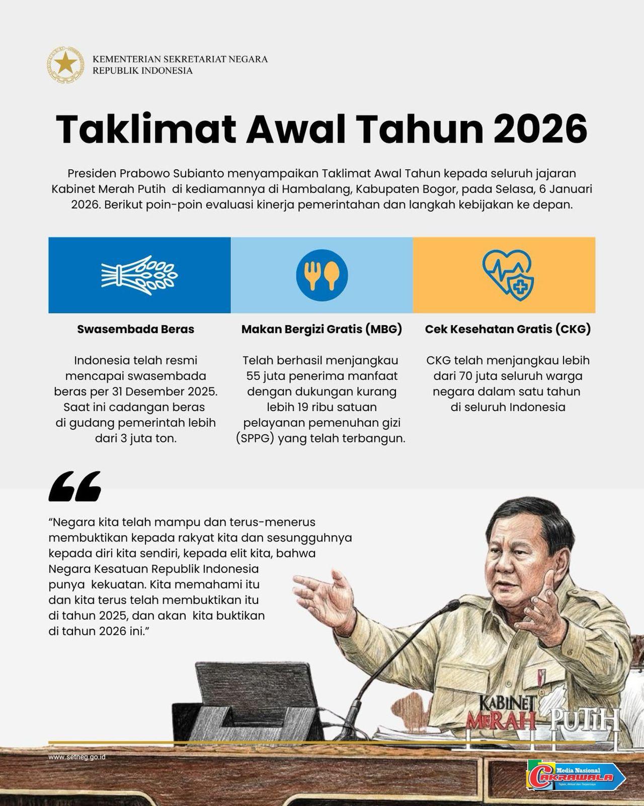 “Hari ini saya sengaja mengundang saudara-saudara berkumpul di Hambalang, di Padepokan Garuda Yaksa untuk memberi taklimat awal tahun 2026,” ucap Presiden mengawali taklimatnya.