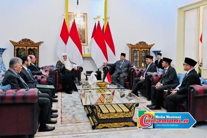 Jakarta,Cakrawala-Presiden RI Prabowo Subianto menerima Sekretaris Jenderal Liga Muslim Dunia, Syaikh Dr. Muhammad Abdul Karim Al-Issa, di Istana Merdeka, Jakarta,Syaikh Al-Issa menilai Indonesia di bawah kepemimpinan Presiden Prabowo memiliki pengaruh yang sangat kuat di dunia Islam maupun pada tataran global.