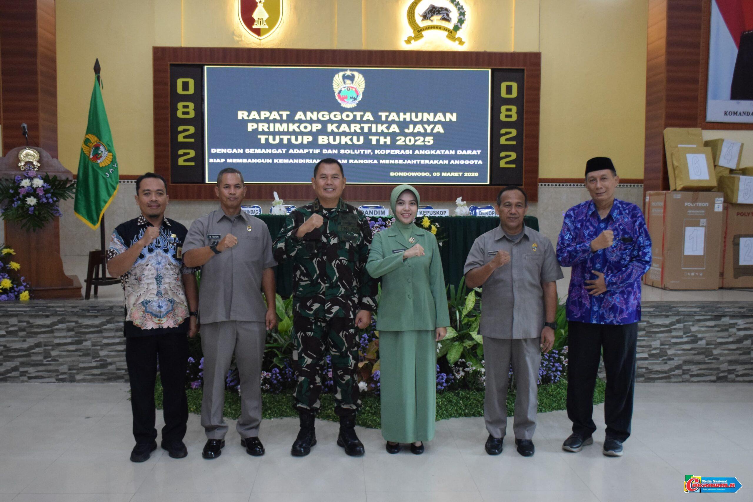 Bondowoso,MN Cakrawala – Kodim 0822 Bondowoso menggelar Rapat Anggota Tahunan (RAT) Ke-XLIII Primer Koperasi Kartika Jaya Tutup Buku Tahun 2025. Acara tersebut dihadiri dan dibuka langsung oleh Dandim 0822 Letkol Inf Prawito, Perwira staf, Danramil dan anggota jajaran serta Ketua Persit KCK Cab. XXXVI Dim 0822 yang berlangsung di Aula Jenderal Sudirman Makodim Jl. Letnan Sutarman No. 06 Bondowoso, Kamis (5/3/2026).