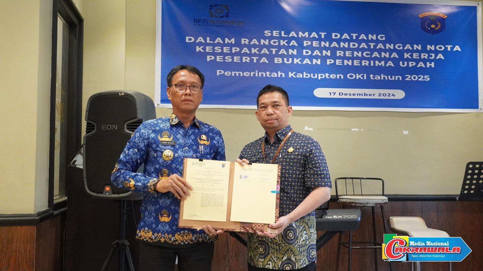 Pemerintah Kabupaten (Pemkab) Ogan Komering Ilir (OKI) bersama Badan Penyelenggara Jaminan Sosial (BPJS) Kesehatan melakukan penandatanganan kerjasama perpanjangan Program Jaminan Kesehatan Nasional (JKN) untuk 2025, di Ruang Pertemuan RM Pagi Sore Kayuagung, Selasa (17/12).