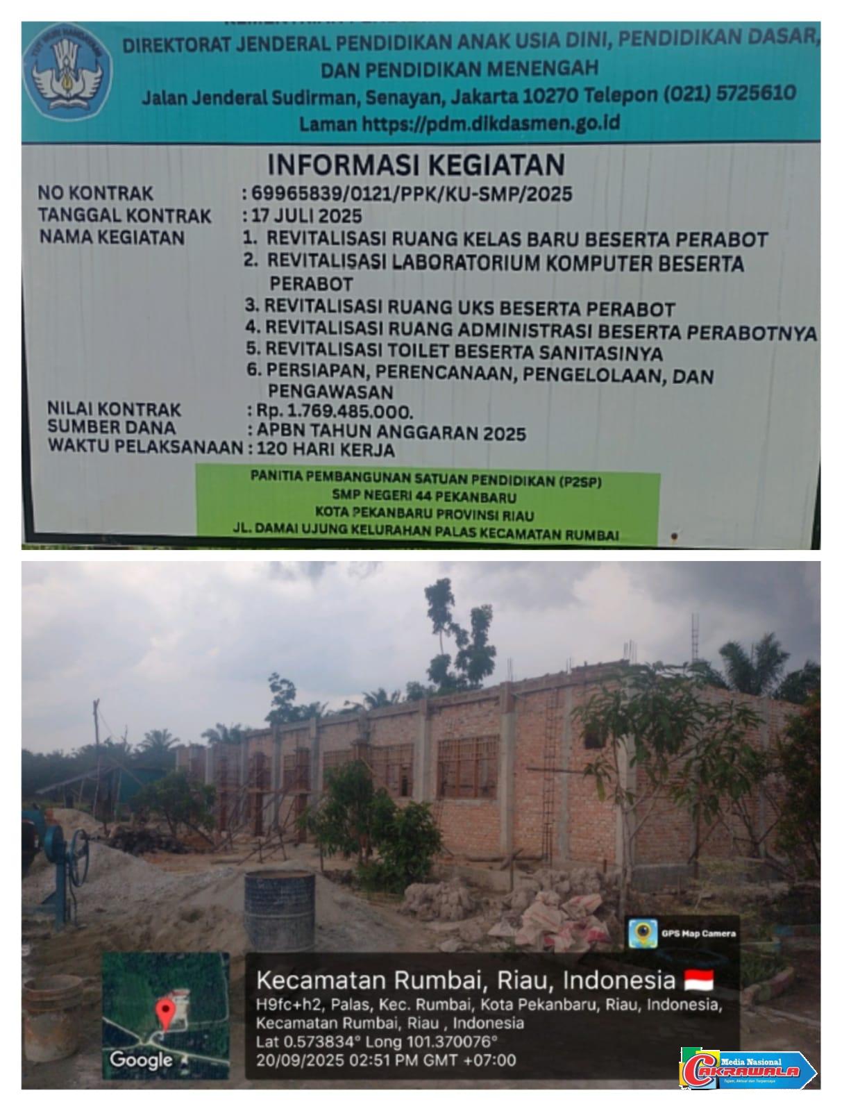 Pekanbaru,Cakrawala – Proyek revitalisasi sarana dan prasarana di SMP Negeri 44 Pekanbaru yang bersumber dari APBN Tahun Anggaran 2025 senilai Rp1,76 miliar kembali menuai sorotan tajam.