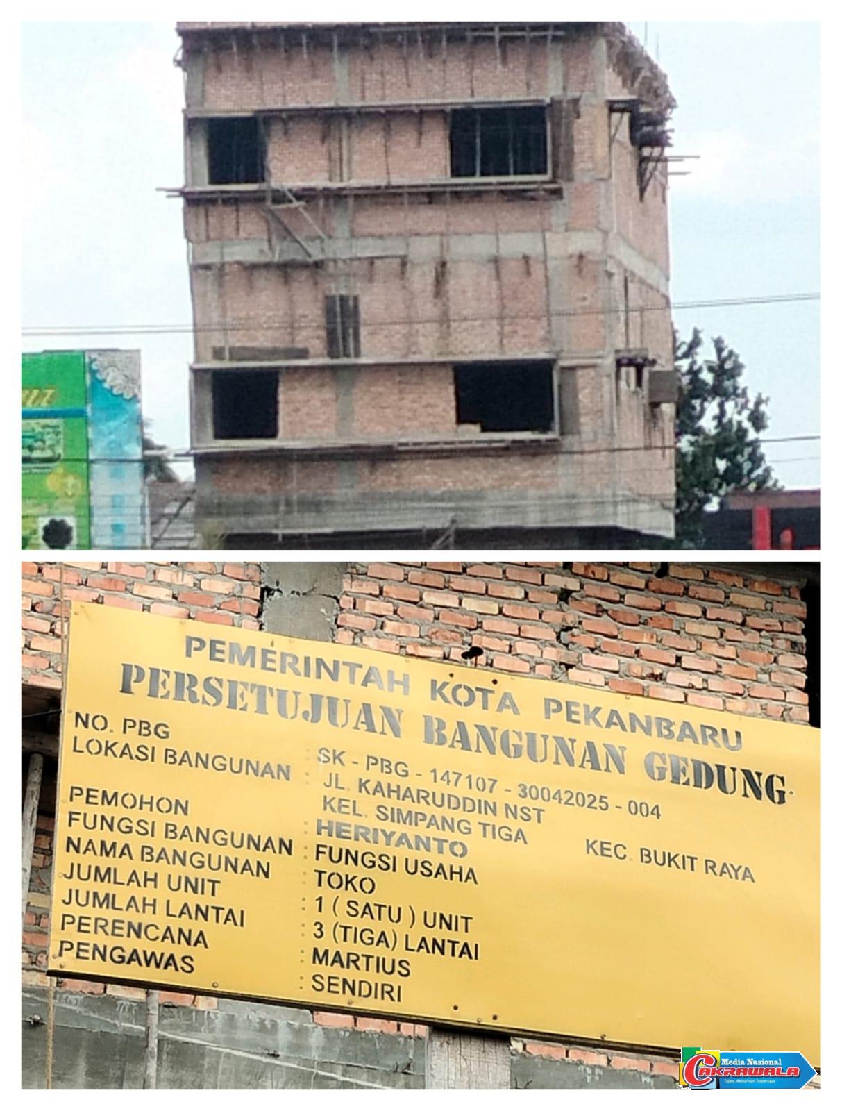 Berdasarkan plang yang terpasang di lapangan, bangunan tersebut mengantongi PBG Nomor SK-PBG-147107-30042025-004, diterbitkan Pemerintah Kota Pekanbaru pada 30 April 2025, atas nama Heriyanto. Dalam keterangan plang, bangunan diperuntukkan sebagai fungsi usaha (toko) sebanyak 1 unit dengan 3 lantai, berlokasi di Jalan Kaharuddin NST, Kelurahan Simpang Tiga, Kecamatan Bukit Raya.