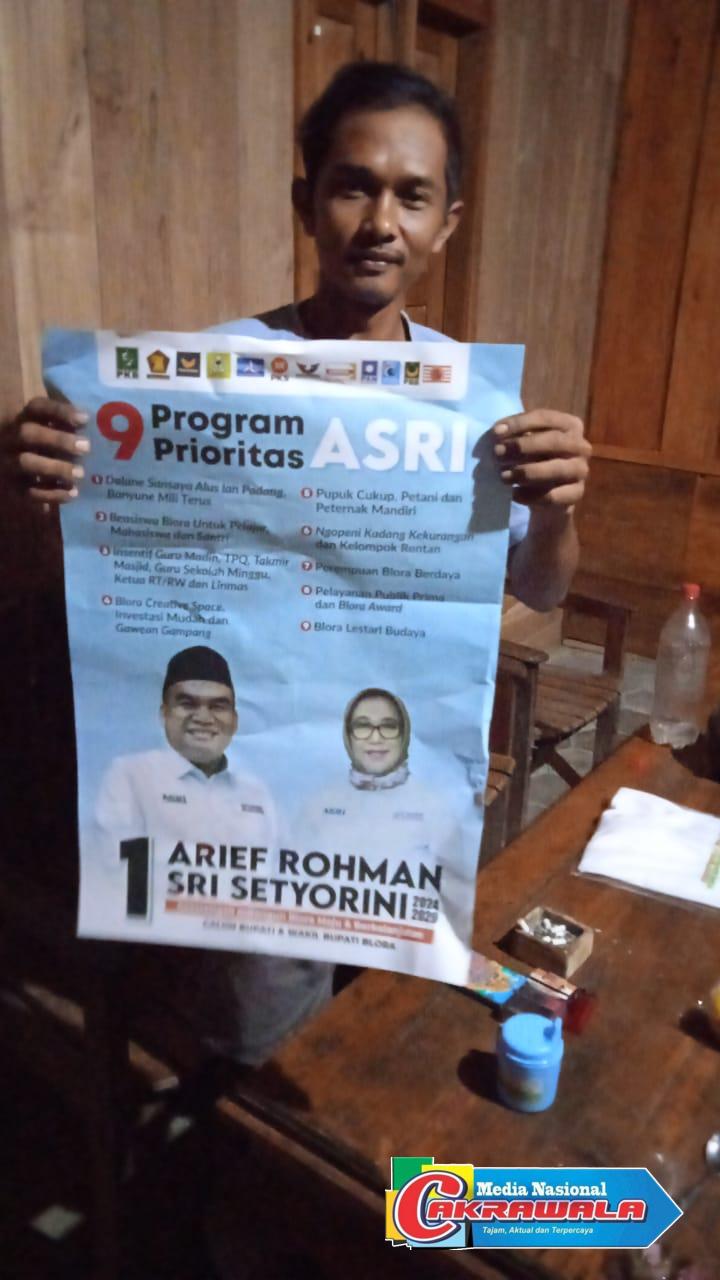 Cakrawala Blora -Relawan Rumah Juang ASRI tak lelah melaksanakan kegiatan sosialisasi pasangan Arief Rohman dan Sri Sulityorini (ASRI) dengan menyebar stiker, kaos, poster, serta brosur misi dan visi pasangan tersebut. Kegiatan ini berlangsung di beberapa desa di Kecamatan Jati, antara lain Desa Randulawang, Dukuh Sucen Desa Gabusan, Dukuh Pakuwon, Desa Singget, Dukuh Kemadoh, Desa Jati, hingga Desa Doplang, pada Jumat (18/10/2024).