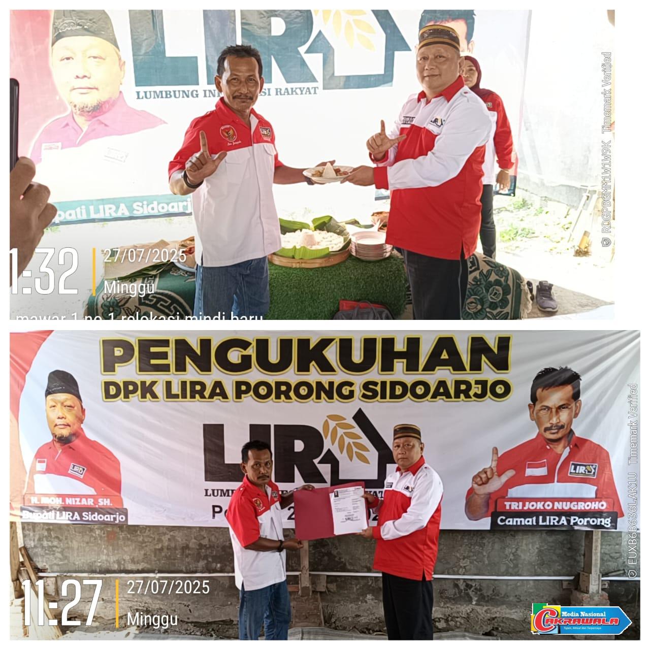 Sidoarjo,Cakrawala-Dewan Pimpinan Kecamatan (DPK) Lumbung Informasi Rakyat (LIRA) Porong resmi dikukuhkan pada Minggu, 27 Juli 2025. Acara pengukuhan berlangsung di Kantor DPK LIRA Porong yang beralamat di Jalan Anggrek No. 16, Relokasi Mindi Baru, Desa Kesambi, Kecamatan Porong.