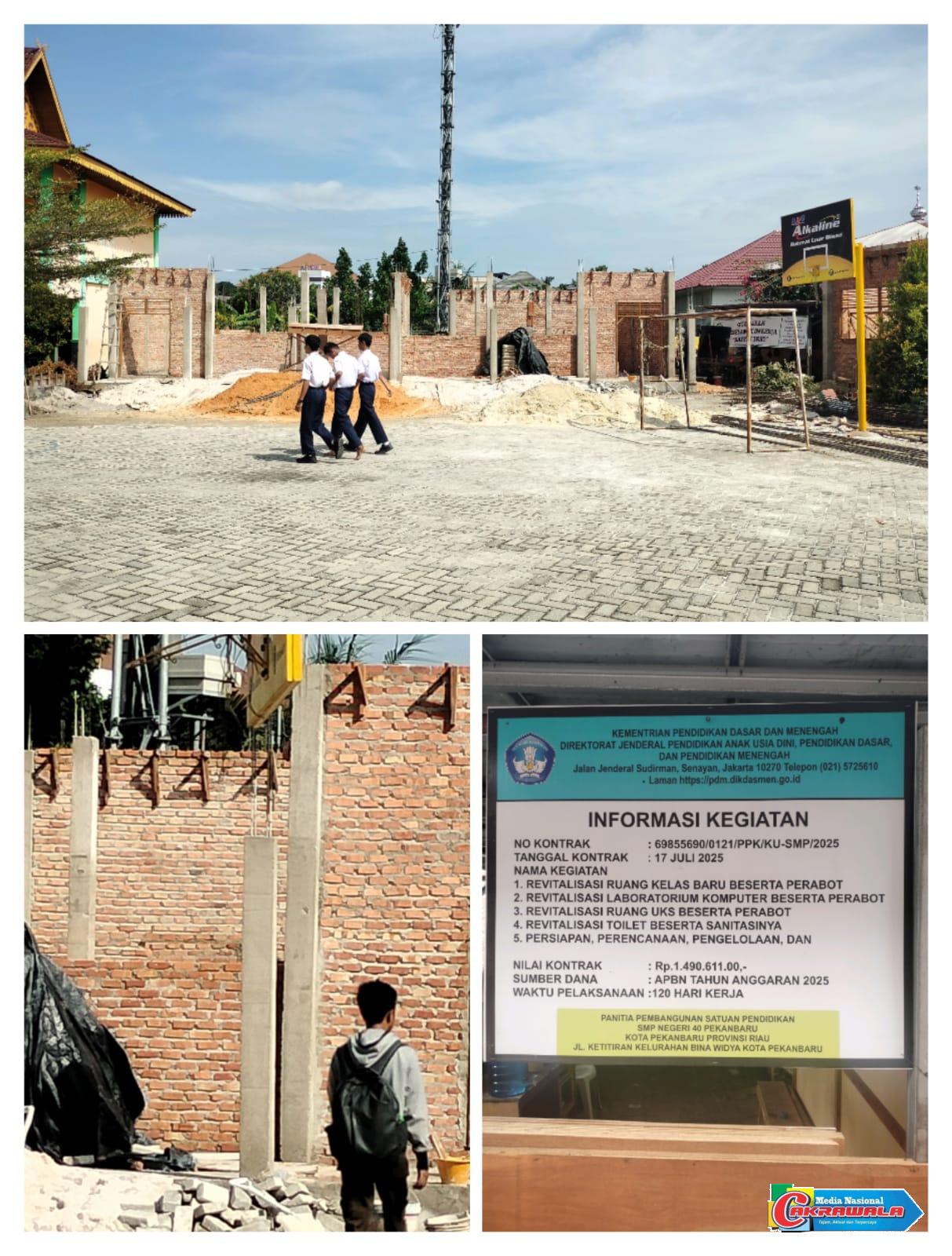Pekanbaru,Cakrawala-Proyek revitalisasi SMP Negeri 40 Pekanbaru senilai Rp1,49 miliar dari APBN 2025 kini jadi sorotan. Alih-alih menghadirkan bangunan kokoh dan layak, temuan di lapangan justru menunjukkan kejanggalan serius.