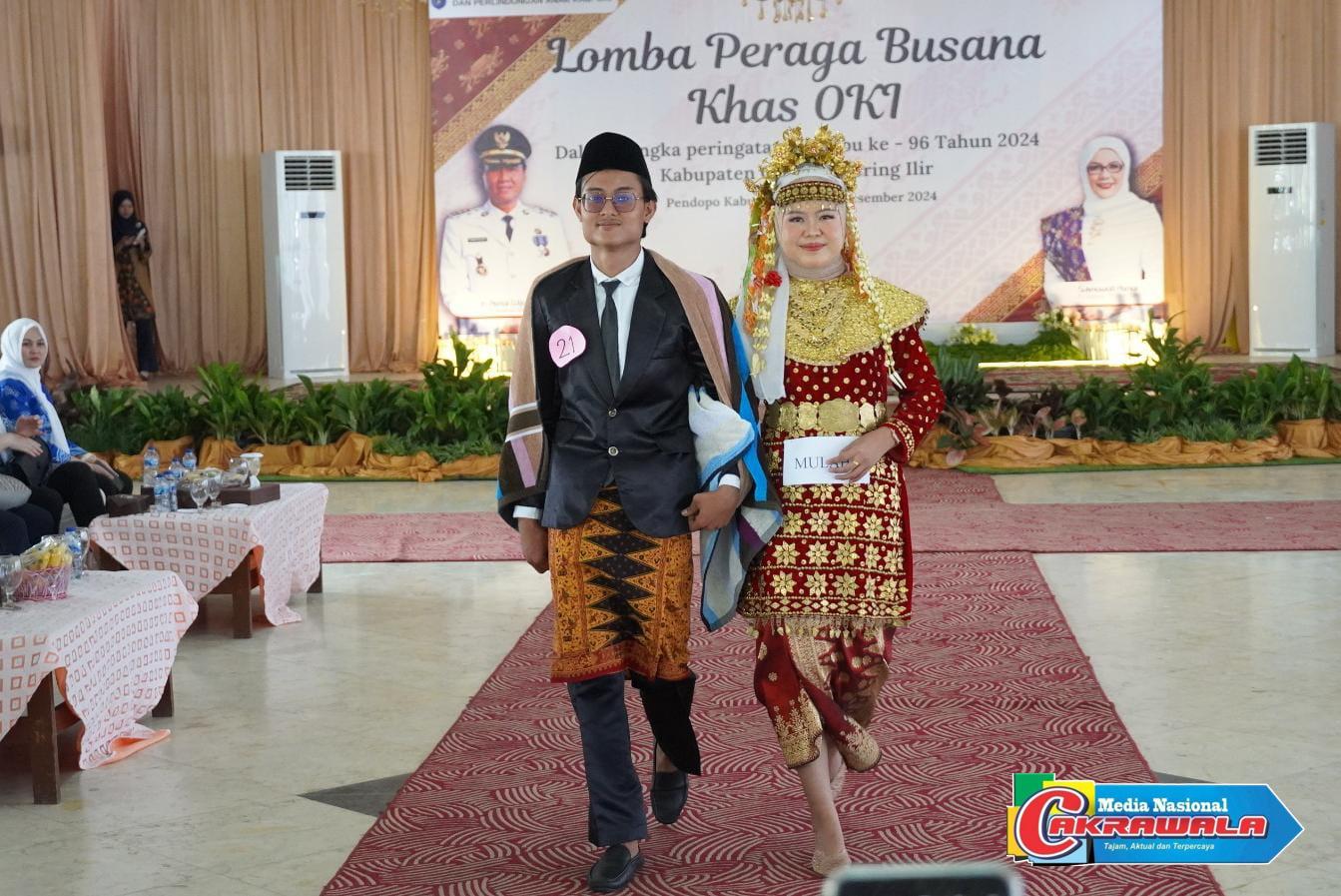 Sementara itu, lomba peragaan busana adat khas OKI menampilkan keindahan pakaian tradisional daerah dengan berbagai motif dan warna yang mencerminkan kekayaan budaya Ogan Komering Ilir. Para peserta, yang tampil secara berpasangan, menunjukkan kebanggaan mereka dalam mengenakan busana adat di depan dewan juri dan penonton.
