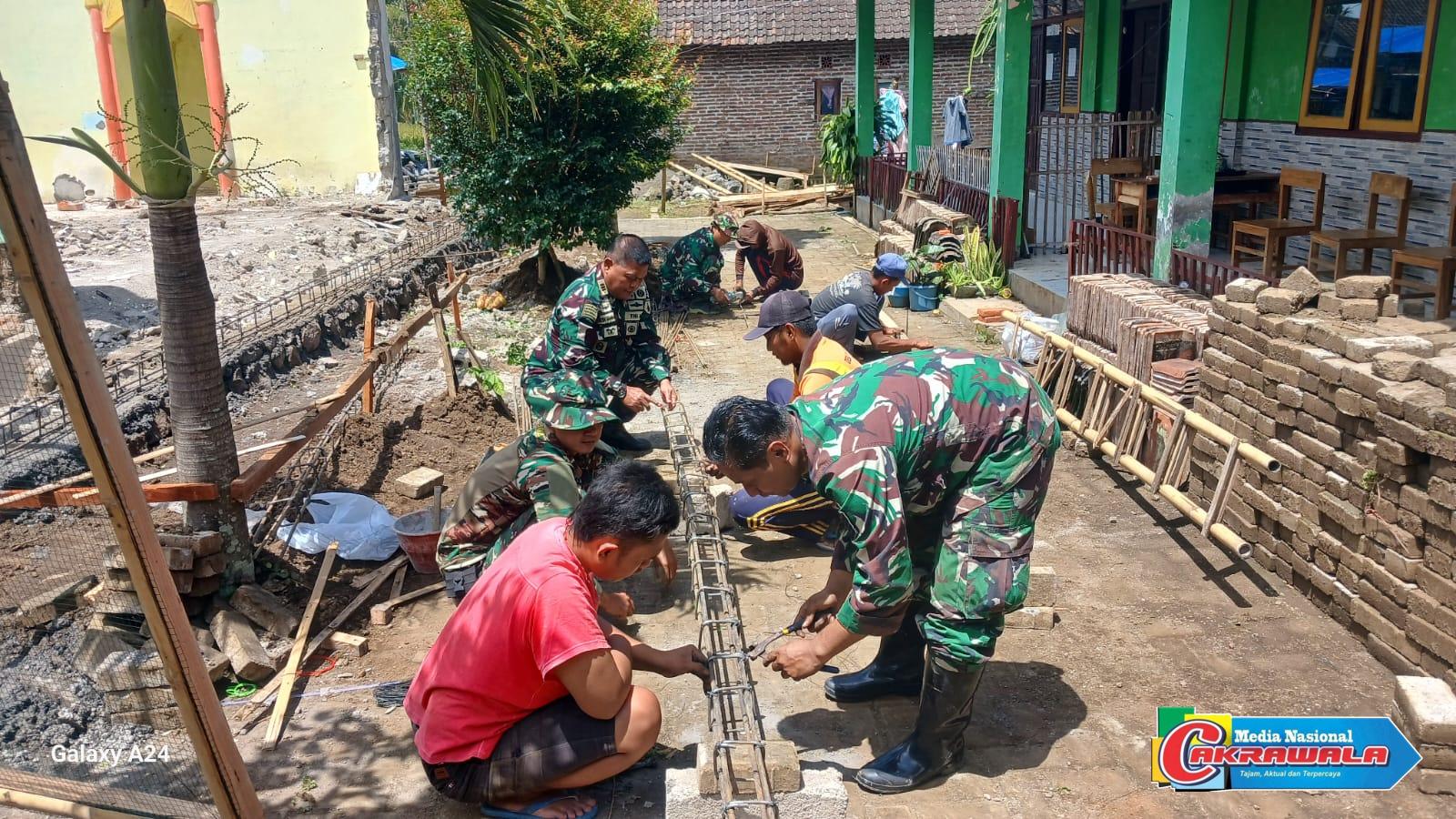 Bondowoso,Cakrawala– Anggota Satgas Pra TNI Manunggal Membangun Desa (TMMD) Reguler ke-123 tahun 2025 Kodim 0822/Bondowoso, Kembali bekerja dengan merangkai besi untuk membuat pondasi mushola di Ponpes Nurul Huda di Desa Gunosari Kecamatan Tlogosari Kabupaten Bondowoso, Kamis (13/02/2025).