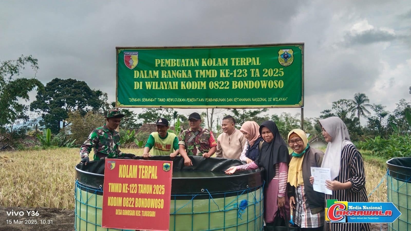 Bondowoso,Cakrawala – Babinsa Koramil 0822/13 Tlogosari Sertu Bambang Irawan bersama anggota Satgas TMMD serta Dinas Perikanan Kab. Bondowoso menebar bibit ikan lele sebanyak 4500 bibit pada Sabtu (15/3/2025) di kolam terpal bantuan sosial kepada masyarakat di Desa Gunosari sebagai lokasi pelaksanaan TNI manunggal Membangun Desa (TMMD) Ke 123 Kodim 0822 Bondowoso.