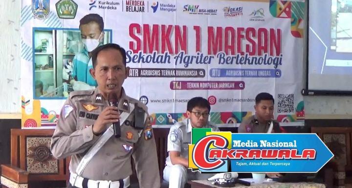 Bondowoso,MNCakrawala-Satuan Lalu Lintas Polres Bondowoso berkolaborasi dengan Jasa Raharja menggelar acara sosialisasi keselamatan lalu lintas di dua sekolah yang ada di jalan Sukowono Maesan yakni SMKN 1 Maesan dan SMPN 1 Maesan Bondowoso pada Jumat, 13 September 2024.