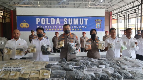 Pada, Senin (20/4) dini hari sekira pukul 01.30 Wib, tepat di pintu keluar Gerbang Tol Lubuk Pakam, Tim langsung menghadang dari depan dan belakang mobil dan saat itu berhasil ditangkap pelaku, J Alias I dan R serta anak berinisial, M Alias N. “Dari para tersangka disita barang bukti antara lain, 53 Kg sabu, 3.249 cartridge pod vape mengandung narkoba, 9.112 butir ekstasi berbagai merek dan 350 kemasan narkoba jenis happy water,”jelasnya.