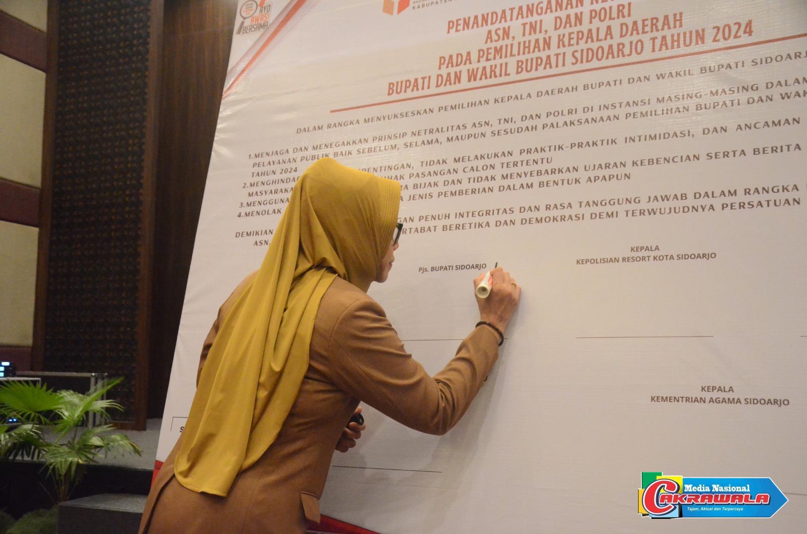 Sidoarjo, MN Cakrawala– Pemilihan Umum Kepada Daerah/Pemilukada serentak 2024 kian dekat. Tanggal 27 November 2024 waktu pencoblosan dimulai. Kabupaten Sidoarjo menjadi salah satu daerah yang ikut melaksanakannya. Sekda Sidoarjo Fenny Apridawati berharap pelaksanaan Pemilukada Bupati dan Wakil Bupati Sidoarjo nanti berjalan aman dan lancar. Ia meminta seluruh ASN Sidoarjo turut menjaga proses demokrasi Pemilukada serentak 2024 di Kabupaten Sidoarjo. Caranya dengan menjaga netralitas sebagai abdi negara. Tidak dukung mendukung Pasangan Calon/Paslon. Apalagi berpolitik praktis dalam melaksanakan tugasnya sebagai seorang ASN. Asas netralitas diminta Sekda Sidoarjo benar-benar dijunjung tinggi oleh seluruh ASN Sidoarjo.
