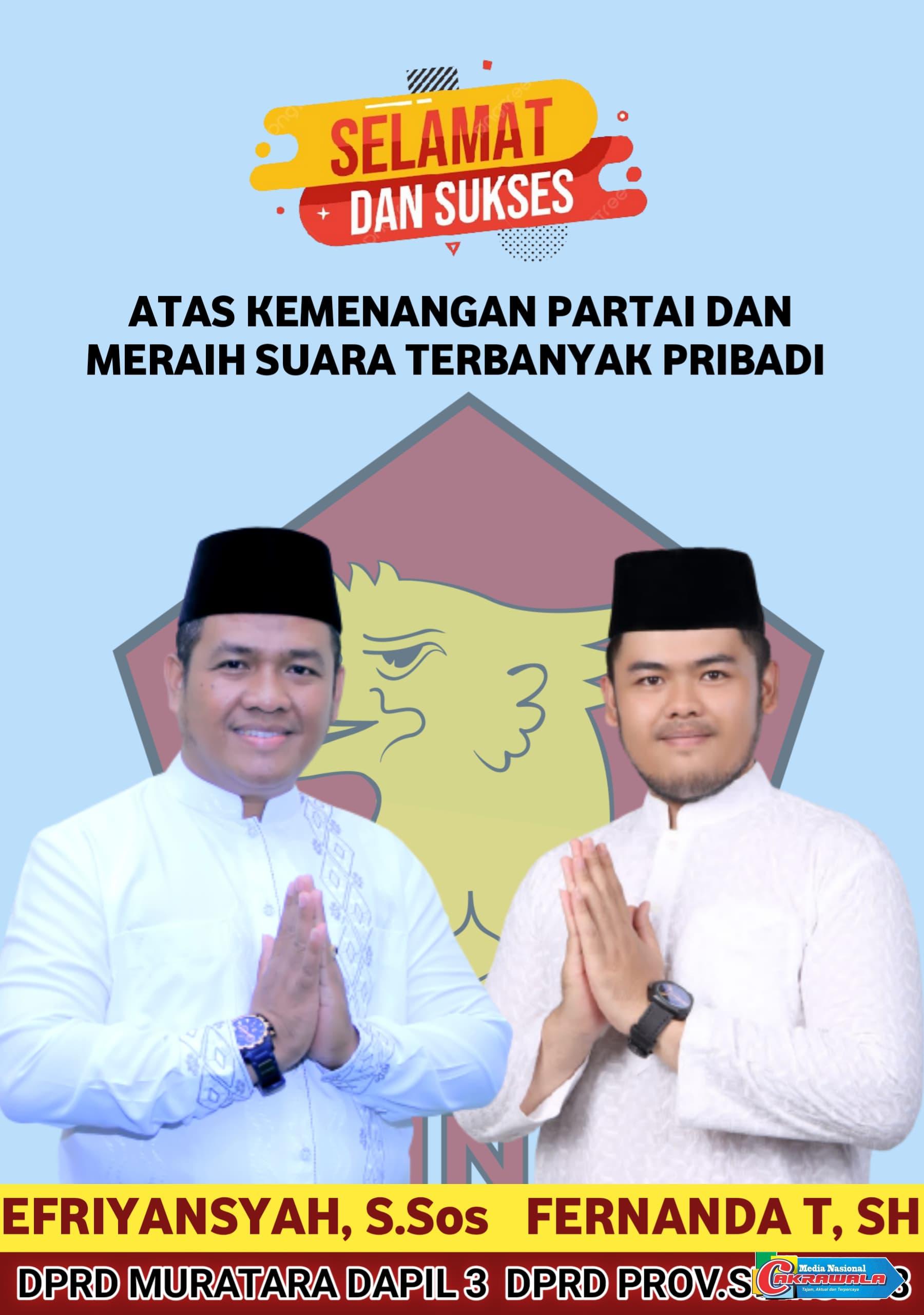 Muratara,MNCakrawala-Ucapan Selamat untuk DPRD Kabupaten Muratara Dapil 3 Efriyansyah dan DPRD Provinsi SUMSEL Dapil 8 Fernanda T,SH Wilayah Pemilihan Musi Rawas dan Lubuklinggau juga Muratara.(Asropil)