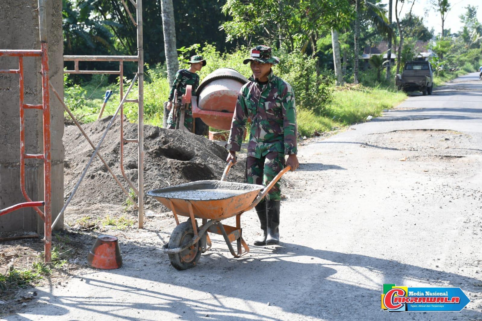 Serka Usman salah satu personel satgas TMMD ke 116 terlihat bersemangat bergotong royong dengan warga mengangkut material dirapatkan ke lokasi pembangunan gapura.