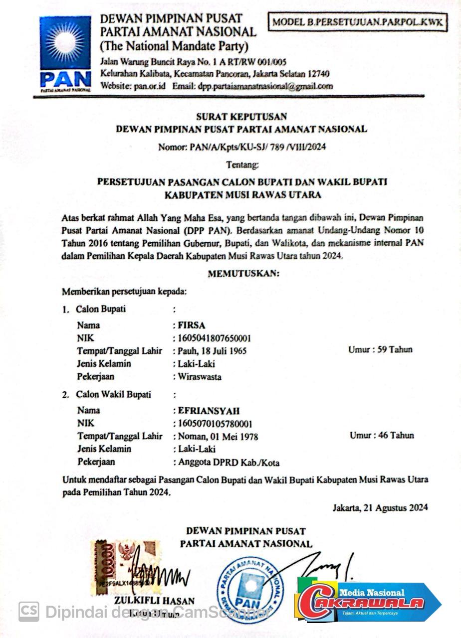 Untuk diketahui, berlabuhnya dukungan Partai Amanat Nasional sebagai salah satu partai pengusung Bapaslon Bupati dan Wakil Bupati Muratara, Firza – Efriyansyah tersebut tertuang dalam Surat Keputusan Dewan Pimpinan Pusat Partai Amanat Nasional nomor: PAN/A/Kota/KU-SJ/789/VIII/2024 tentang Persetujuan Pasangan Calon Bupati dan Wakil Bupati Kabupaten Musi Rawas Utara tertanggal 21 Agustus 2024 yang ditandatangani oleh Ketua Umum PAN, Zulkifli Hasan dan Sekjen PAN, Eddy Soeparno.(As)