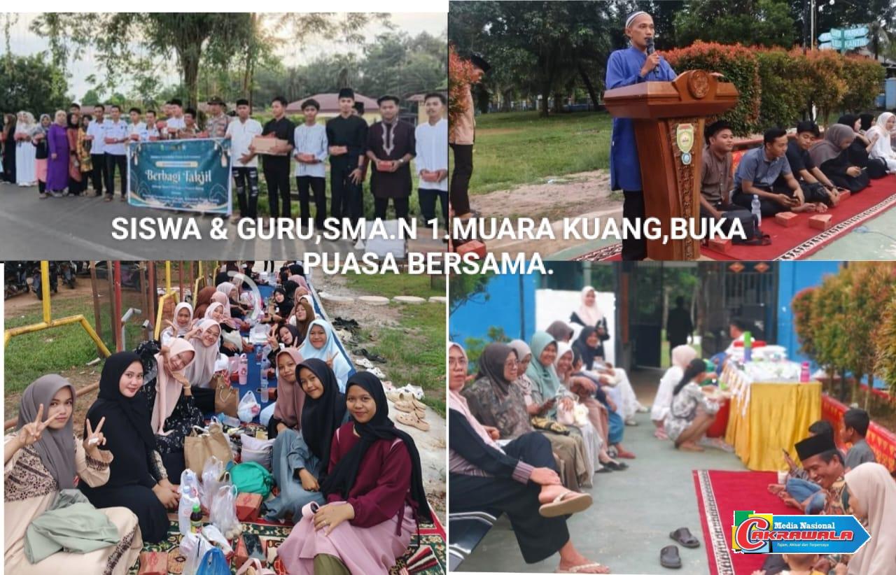 Setelah selesai membagikan takjil kepada masyarakat, seluruh siswa, siswi, dan para guru kembali ke sekolah dan melaksanakan ibadah berbuka bersama di halaman SMAN 1 Muara Kuang.