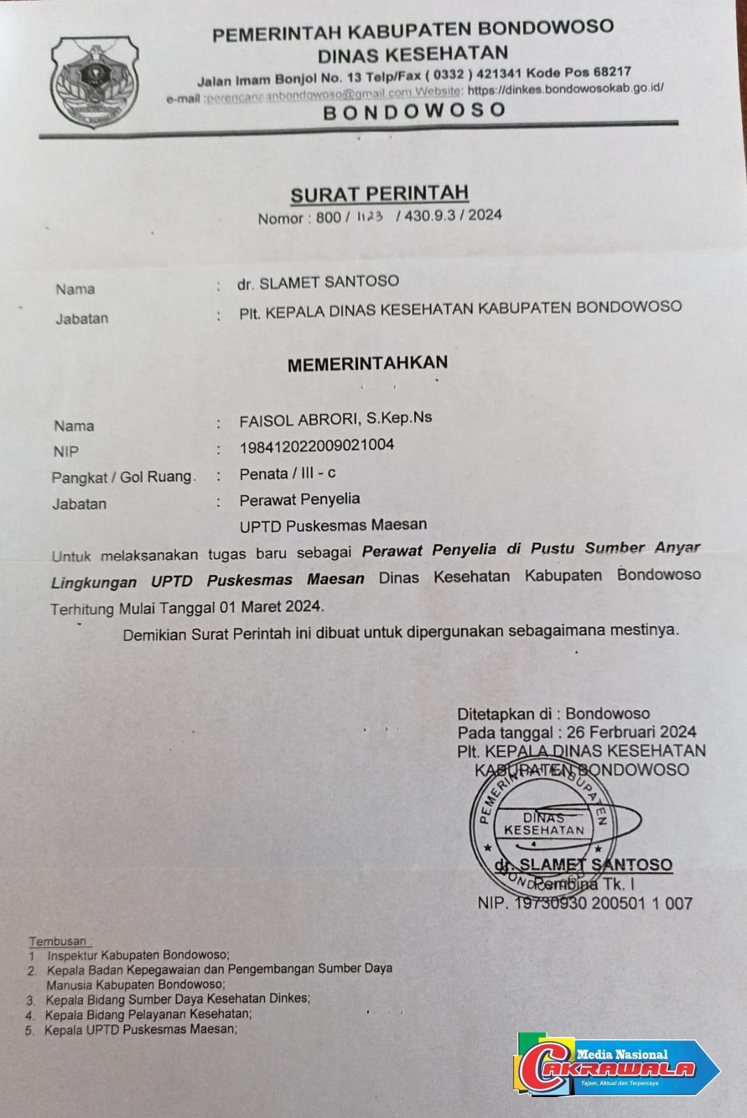 BONDOWOSO,MNCAKRAWALA.COM-Sebuah Surat Perintah (SP) yang diajukan Kapus Maesan dan dikeluarkan oleh Kadinkes Kabupaten Bondowoso rupanya menuai ke kecewaan dari pihak yang bersangkutan lantaran sifatnya diduga serta-merta. Jum’at (01/03/2024).