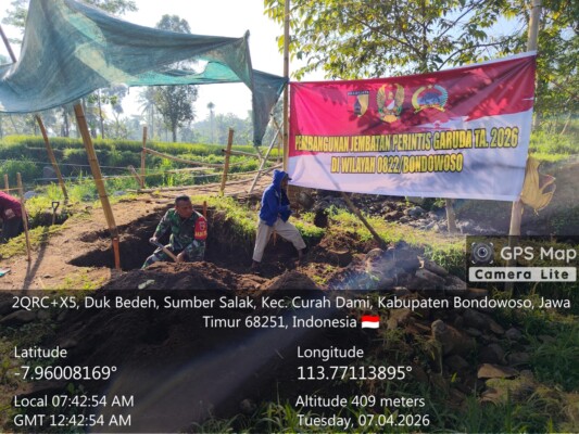Bondowoso,MN Cakrawala – Semangat gotong royong kembali ditunjukkan oleh aparat kewilayahan bersama masyarakat. Kali ini, Babinsa Desa Sumber Salak, Serka Patut Heru dari Koramil 0822/02 Curahdami, turun langsung membantu warga dalam kegiatan penggalian pembangunan Jembatan Perintis Garuda, Selasa (7/4/2026).