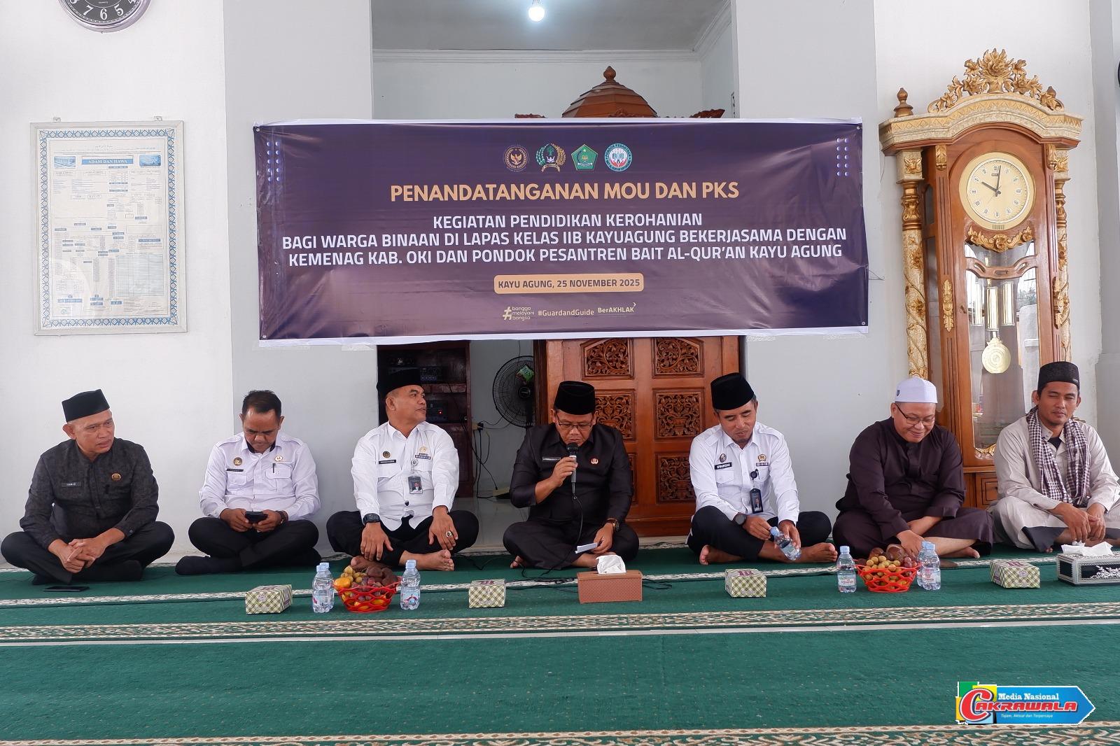 Medianasionalcakrawala.com, Kayuagung — Lembaga Pemasyarakatan (Lapas) Kelas IIB Kayu Agung kembali menunjukkan komitmennya dalam meningkatkan kualitas pembinaan bagi Warga Binaan Pemasyarakatan (WBP). Melalui penandatanganan Perjanjian Kerja Sama (PKS) dengan Kementerian Agama (Kemenag) Kabupaten Ogan Komering Ilir dan Pondok Pesantren Bait Al-Qur’an yang dihadiri langsung oleh Kabid Pelayanan dan Pembinaan Kantor Wilayah Direktorat Jenderal Pemasyarakatan Sumatera Selatan, Misbahuddin. Layanan pembinaan keagamaan kini diperkuat dengan program yang lebih terstruktur dan berkelanjutan. Selasa (25/11)