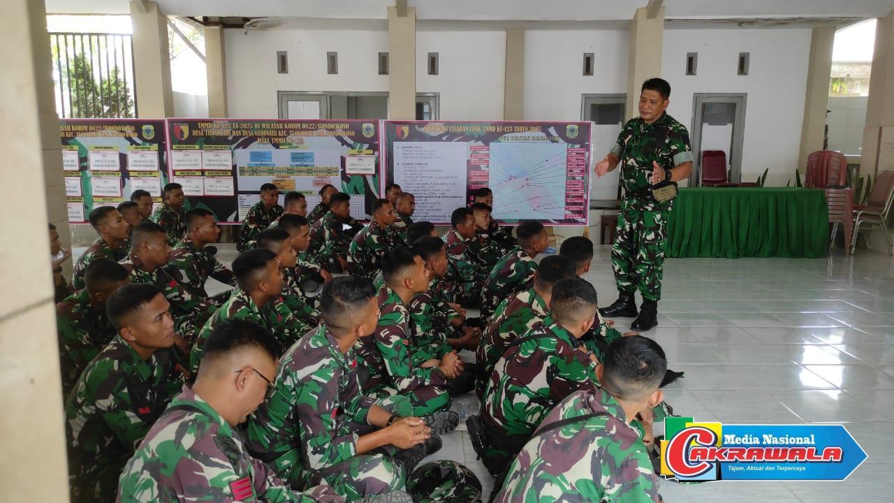 Bondowoso,Cakrawala-Dalam rangka mendukung kelancaran program TNI Manunggal Membangun Desa (TMMD) Ke-123 TA. 2025, Kasdim 0822 Bondowoso Mayor Inf Tanuri, memberikan pengarahan semangat dan motivasi kepada seluruh personel Satgas TMMD. Dalam briefing yang dilaksanakan di Posko TMMD, Kasdim menekankan pentingnya semangat dan keikhlasan dalam menjalankan tugas.