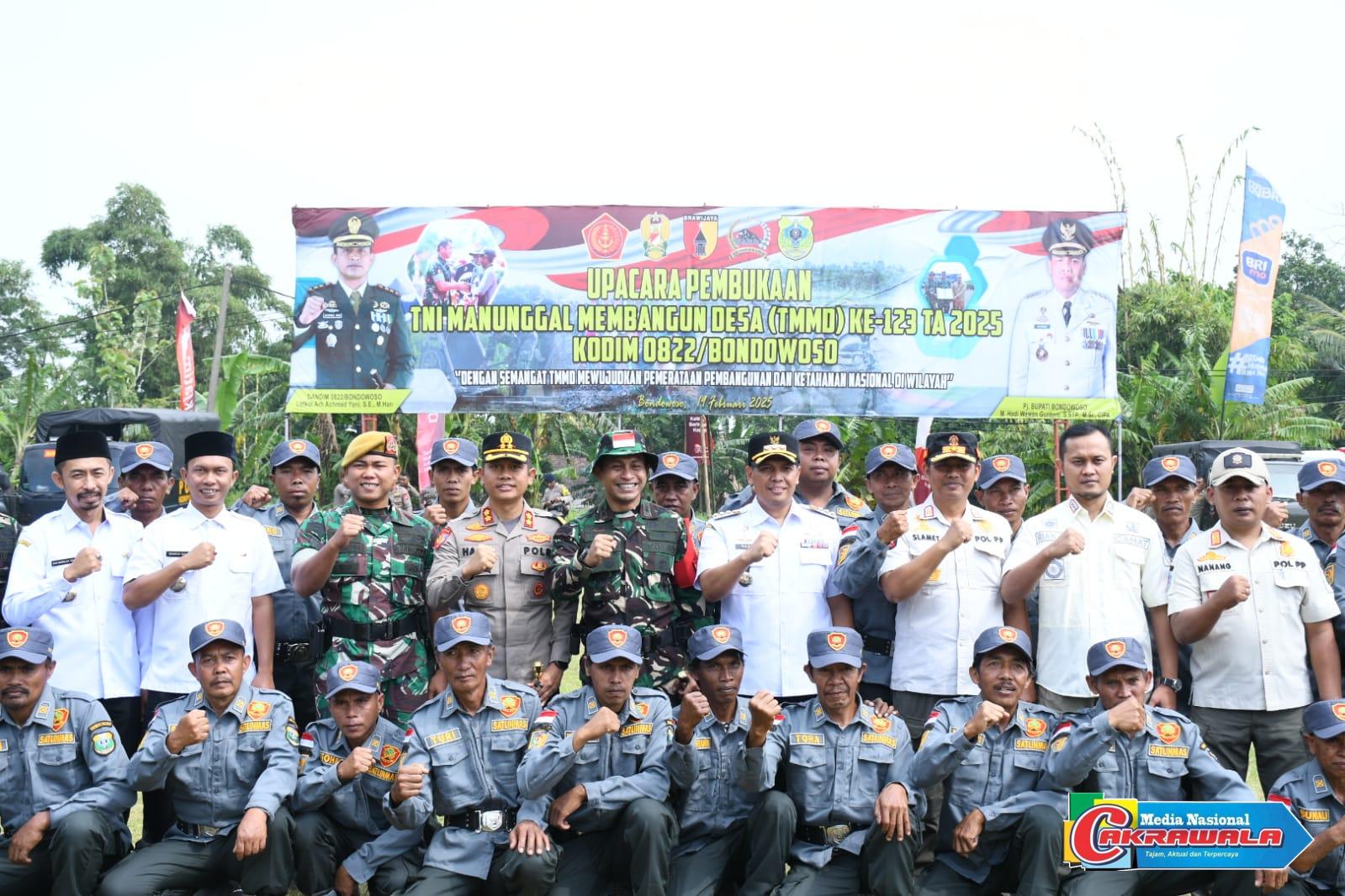 Bondowoso,Cakrawala – Dandim 0822 dan Forkopimda Bondowoso secara resmi membuka dalam acara kegiatan Pembukaan TMMD Ke-123 TA. 2025 di wilayah Kodim 0822 Bondowoso bertempat dilapangan bola Desa Tlogosari Kec. Tlogosari Kab. Bondowoso dengan tema “Dengan Semangat TMMD Mewujudkan Pemerataan Pembangunan Dan Ketahanan Nasional Di Wilayah”, Rabu (19/2/2025).