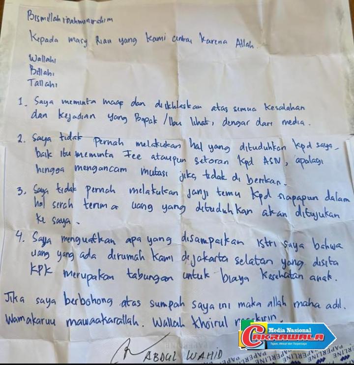 Pekanbaru,Cakrawala – Perpanjangan masa penahanan Gubernur Riau nonaktif H. Abdul Wahid, M.Si., oleh Komisi Pemberantasan Korupsi (KPK) kembali memantik kegaduhan publik. Di tengah derasnya narasi yang menggiring opini seolah perkara telah selesai sebelum palu hakim diketuk, Tim Pencari Fakta (TPF) OTT PUPR justru membuka fakta sensitif yang selama ini disimpannya rapat-rapat: sebuah sumpah atas nama Allah yang diteken langsung oleh Abdul Wahid.