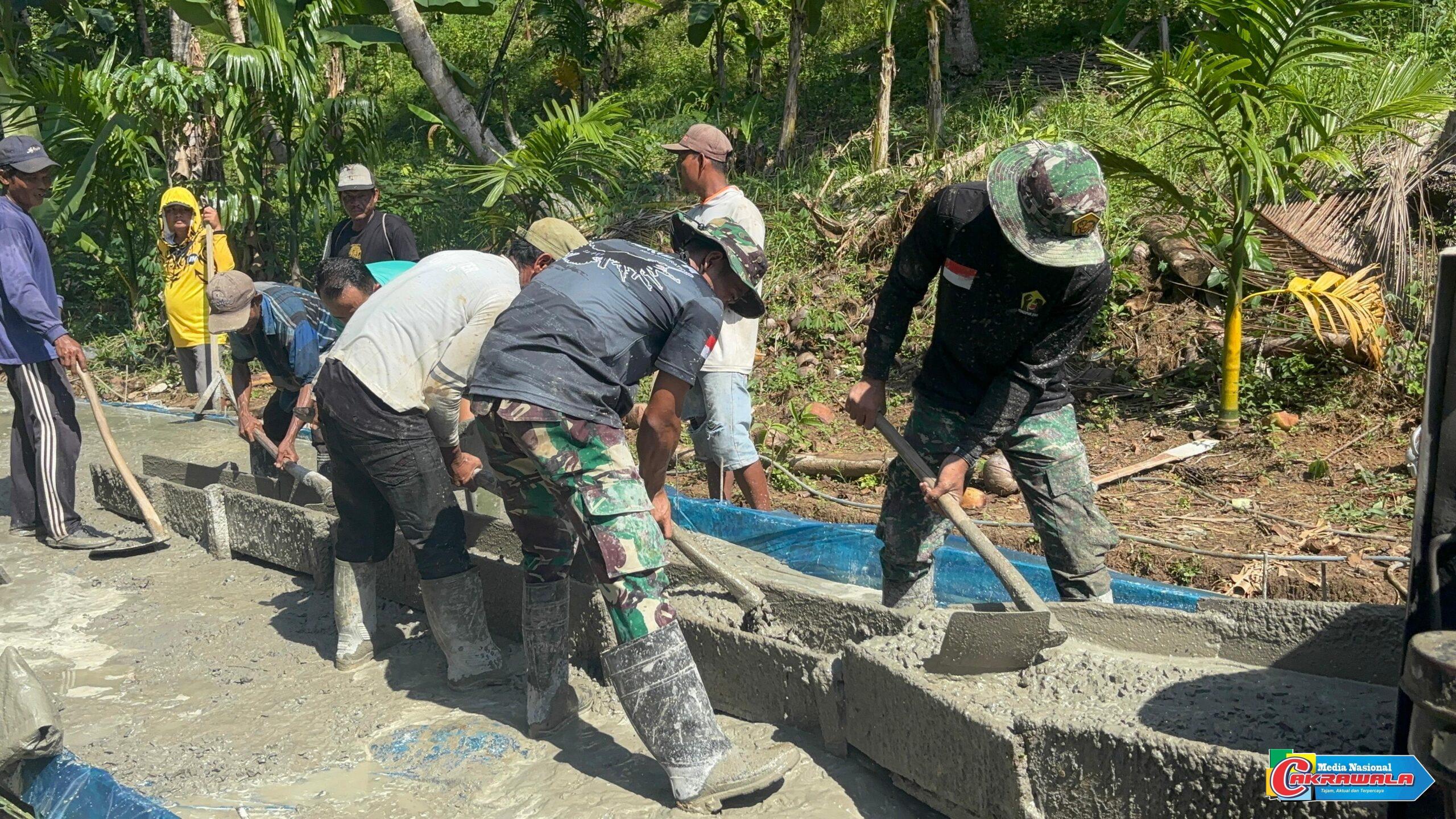 Dengan mengenakan pakaian dinas lapangan dan penuh semangat, Kapten Inf Suroto bergabung bersama personel TNI dan warga setempat dalam proses pengecoran jalan sepanjang ratusan meter yang menjadi salah satu sasaran utama TMMD kali ini.